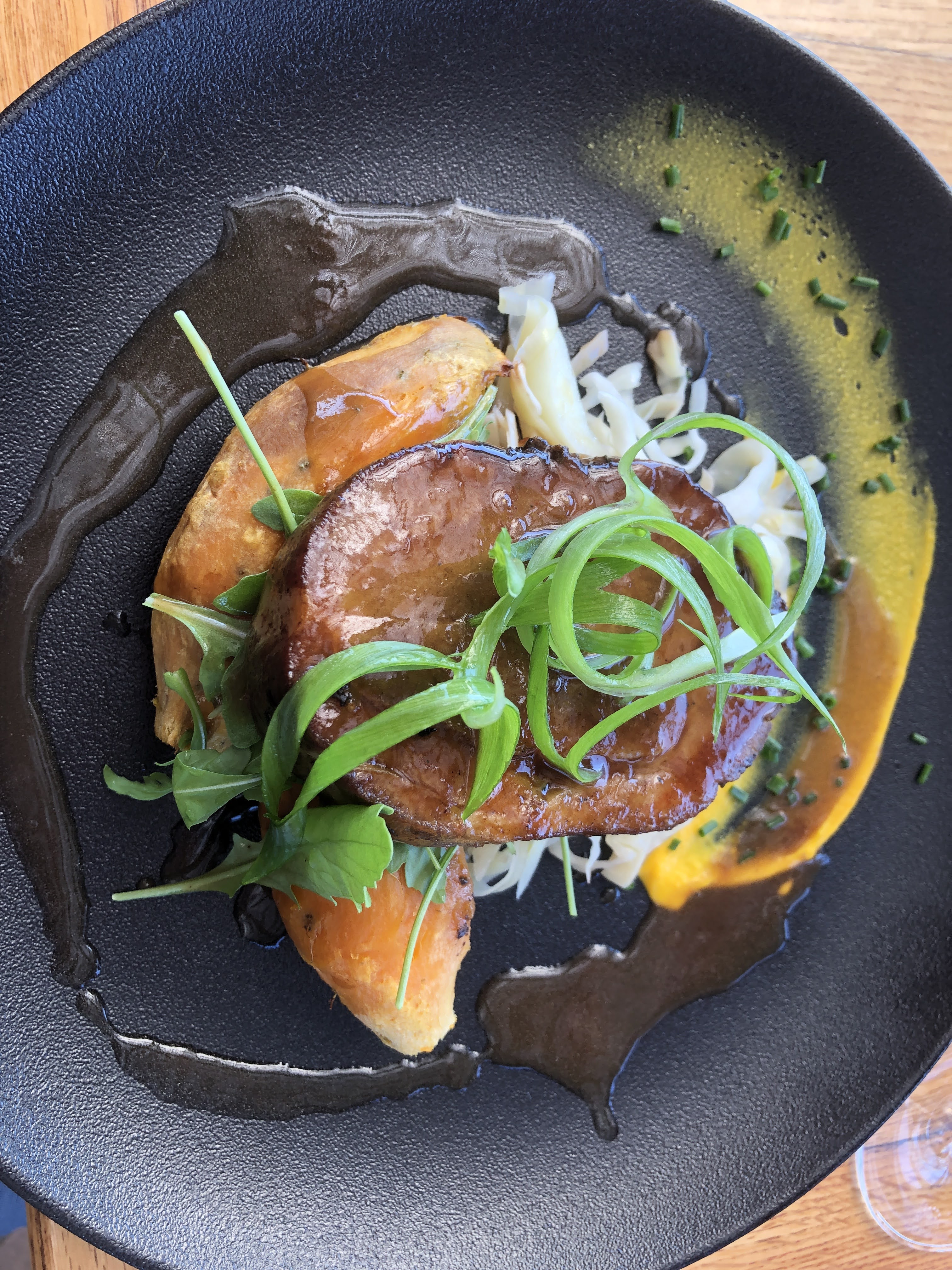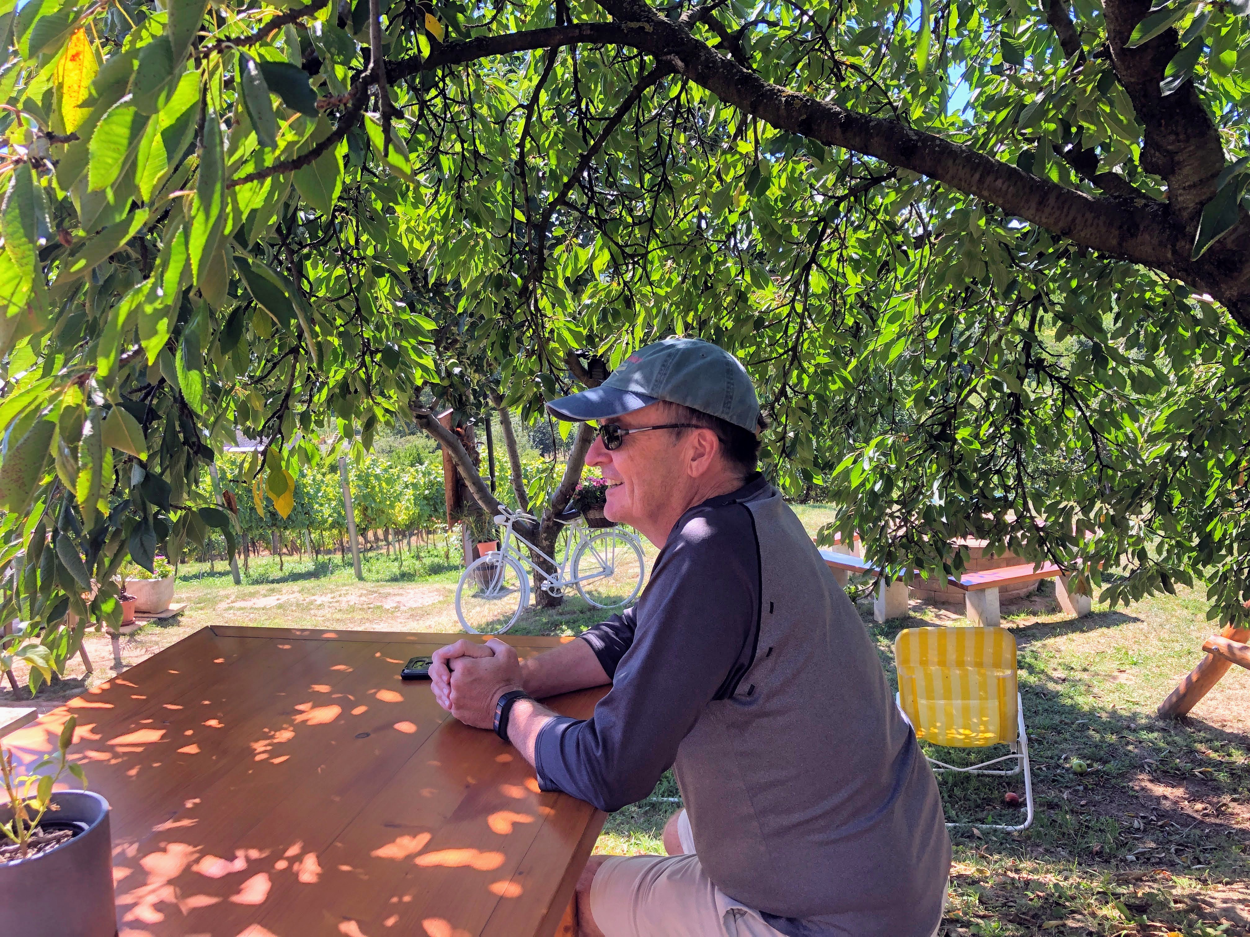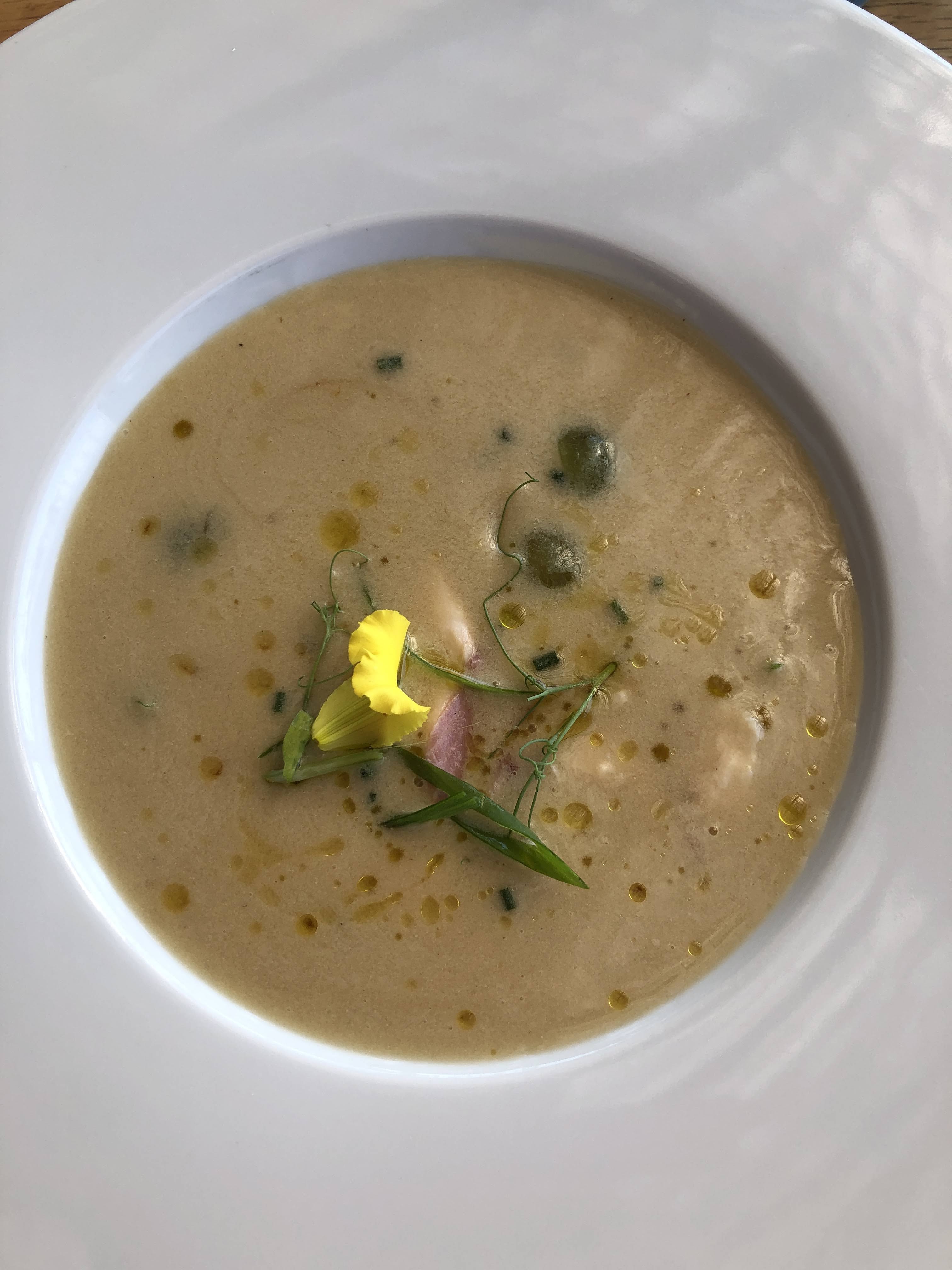 A patio with a view while dining on white grape soup over smoked trout and smoked pork