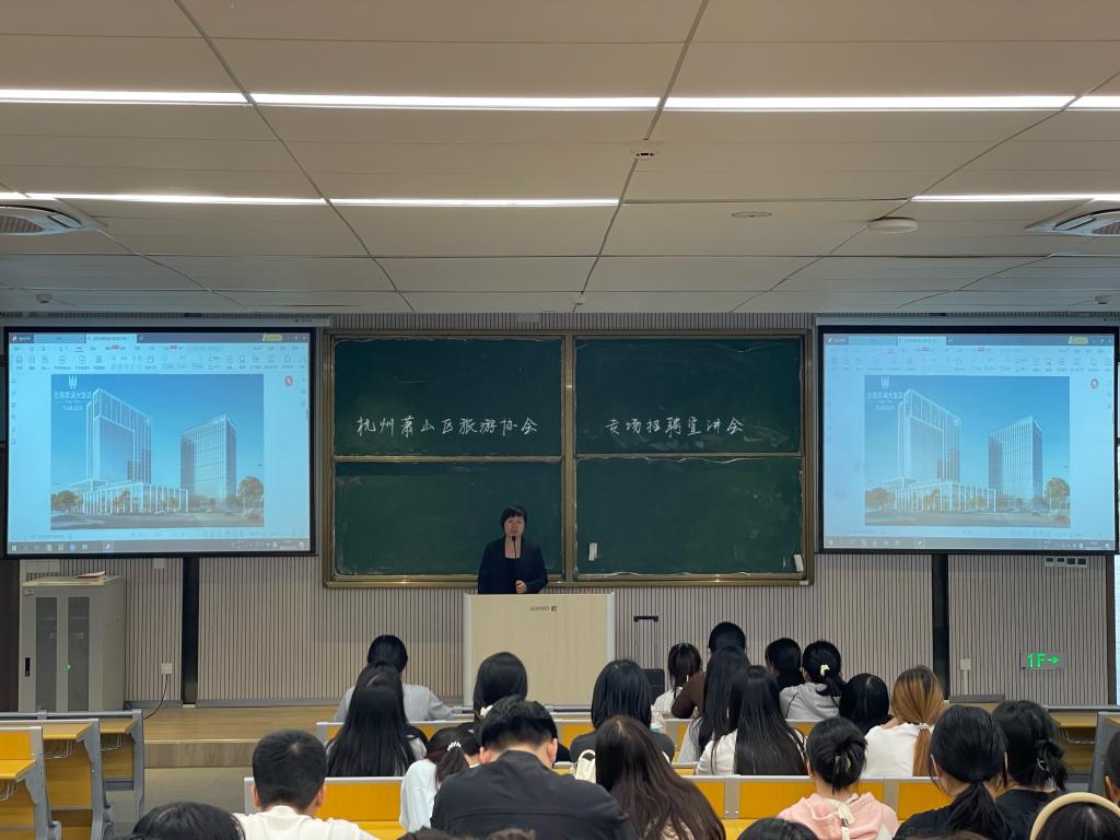 为搭建优质就业平台,深化校企合作,助力文旅人才培养,10月15日,w66利来旗舰厅联合杭州萧山区旅游协会在二教D112教室成功举办专场招聘会。此次招聘会由w66利来旗舰厅党总支副书记熊韬主持,全体26届毕业生到场参加。本次招聘会吸引了18家浙江省知名文旅企业参与,提供岗位230余个,涵盖景区运营、酒店管理、文创设计、新媒体运营等多个领域,为公司2026届毕业生提供了丰富的实习及就业机会。