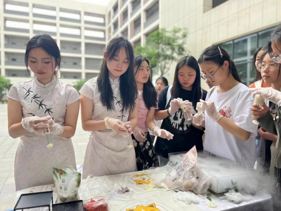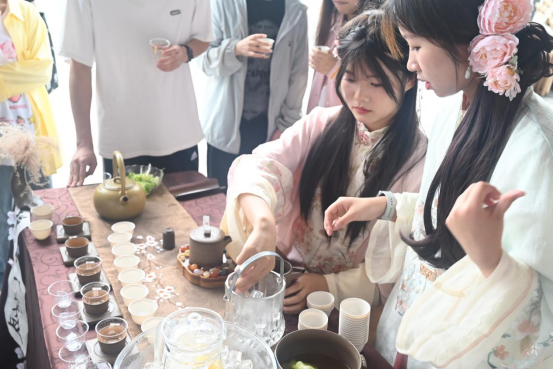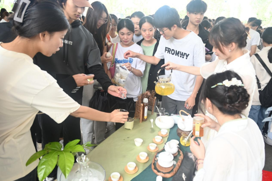 此次活动以“一起来呷茶——修水茶俗体验”为主题,分为修水茶俗体验和创新茶饮品鉴两部分。在专业老师的指导下,茶艺队的同学们身着中华传统服饰,亲手制作茶点,调配柠檬宁红、宁红奶茶、菊花双井、茉莉双井等茶饮,邀请各位同学品鉴。活动吸引了广大爱茶人士的参与,大家一起交流品鉴,共赴茶文化盛宴。