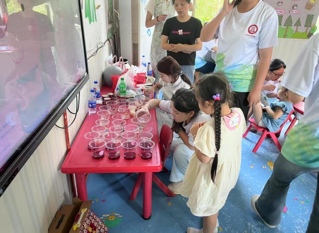 作为中华传统文化的重要载体,茶有着数千年的悠久历史。实践队员们巧妙融合传统茶文化与创意调制艺术,在活动现场为小朋友们展演茶饮特调技艺。他们甄选当季优质原料,通过趣味十足的调制过程,制作出四种风味各异的特色茶饮——或取茉莉花茶清香搭配鲜果芬芳,或用庐山本地云雾茶搭配手工糖艺。活动现场,三十余名小朋友井然列队,满怀期待地品尝着这些兼具传统韵味与创新口感的茶饮,让千年茶文化以鲜活的滋味在舌尖绽放独特魅力。