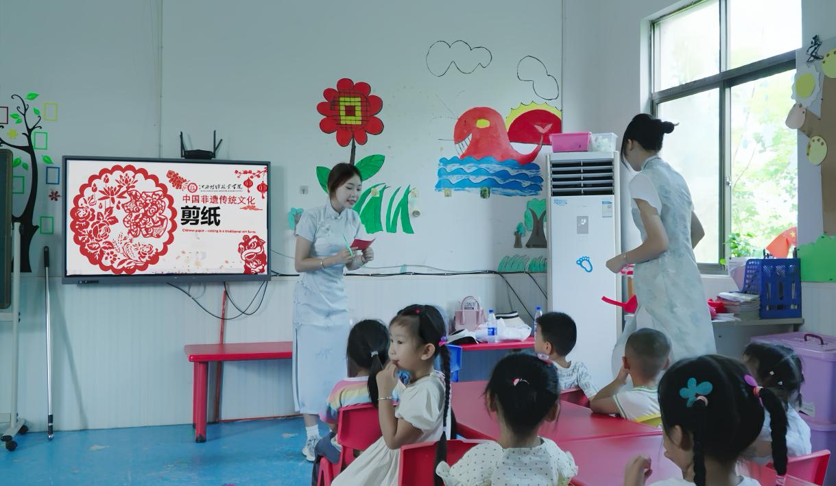 两名曾参与公司非遗剪纸技艺研习训练营的实践队员,以饱满的热情和专业的知识,化身传统文化传播使者:“剪纸艺术,作为中国非物质文化遗产的重要组成部分,承载着千年的文化记忆与民间智慧……”她们从剪纸艺术的历史渊源讲起,带领孩子们走进古老而灵动的剪纸艺术世界。一张张红纸在孩子们手中翻飞,一把把小剪刀灵巧穿梭,每一次成功剪出图案,都伴随着孩子们的惊喜与成就感,教室里洋溢着欢声笑语与浓浓的创作热情。