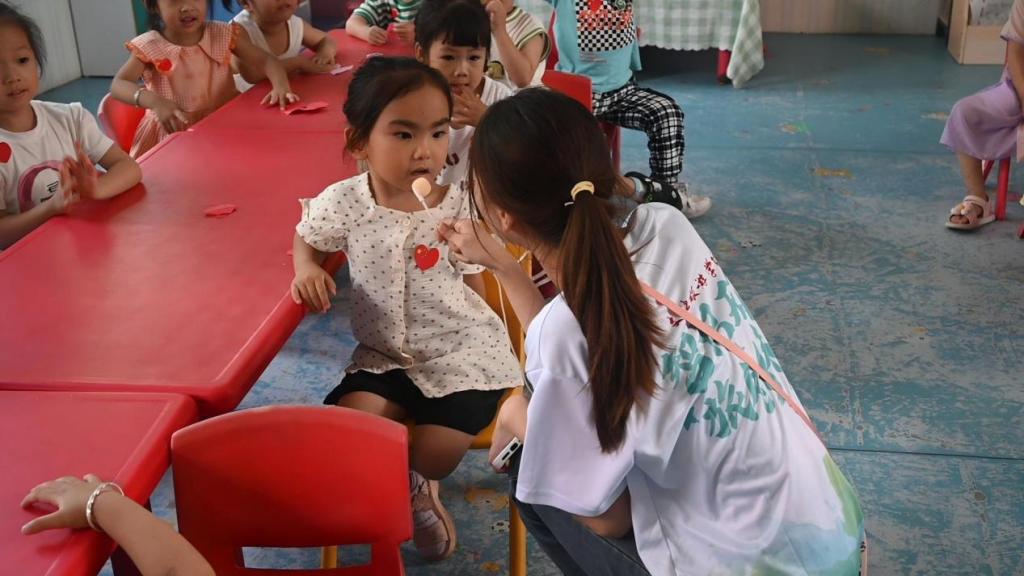 为积极倡导乡村地区卫生健康的生活方式,实践队精心准备了一堂别开生面的卫生课程,将七步洗手法带给了孩子们。课堂以沉浸式游戏互动拉开帷幕,实践队员手持卡通洗手步骤图,模仿起动画片中憨态可掬的螃蟹姿态,边讲解边示范,“内、外、夹、弓、大、立、腕……”小朋友们一边念着口诀,一边认真模仿洗手动作。课程尾声,小朋友们晃着湿漉漉的小手感叹:“原来洗手藏着这么多科学讲究呀!以后我每天都会用七步洗手法认真洗手啦!”。