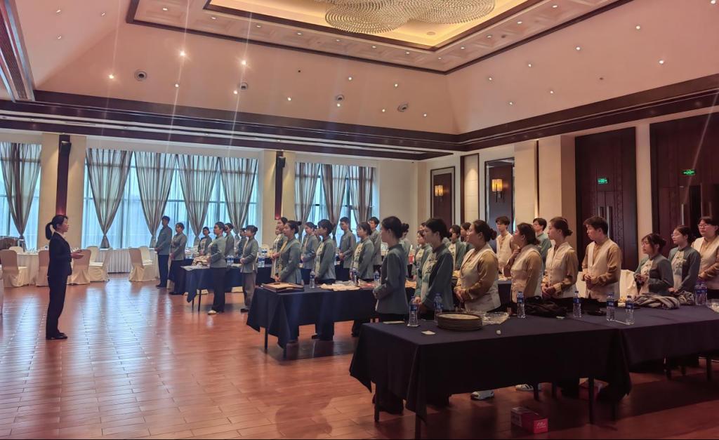 为锻造高标准服务品质,公司与酒店方联合制定分层培训体系,系统强化岗位操作规范与会务礼仪标准。员工团队通过餐饮摆台标准化演练、客房清洁流程化操作等实训项目,将理论课堂转化为职业能力,在政商接待实战中彰显卓越素养:餐饮服务组精准执行中西餐服务规程,高效完成西式自助餐分流与中式包厢定制化接待;客房服务组创新“网格化响应”机制,实现入住引导、需求反馈等环节无缝衔接。员工们严谨的职业态度、娴熟的服务技巧及协作精神,赢得主办方与参会嘉宾高度赞誉。